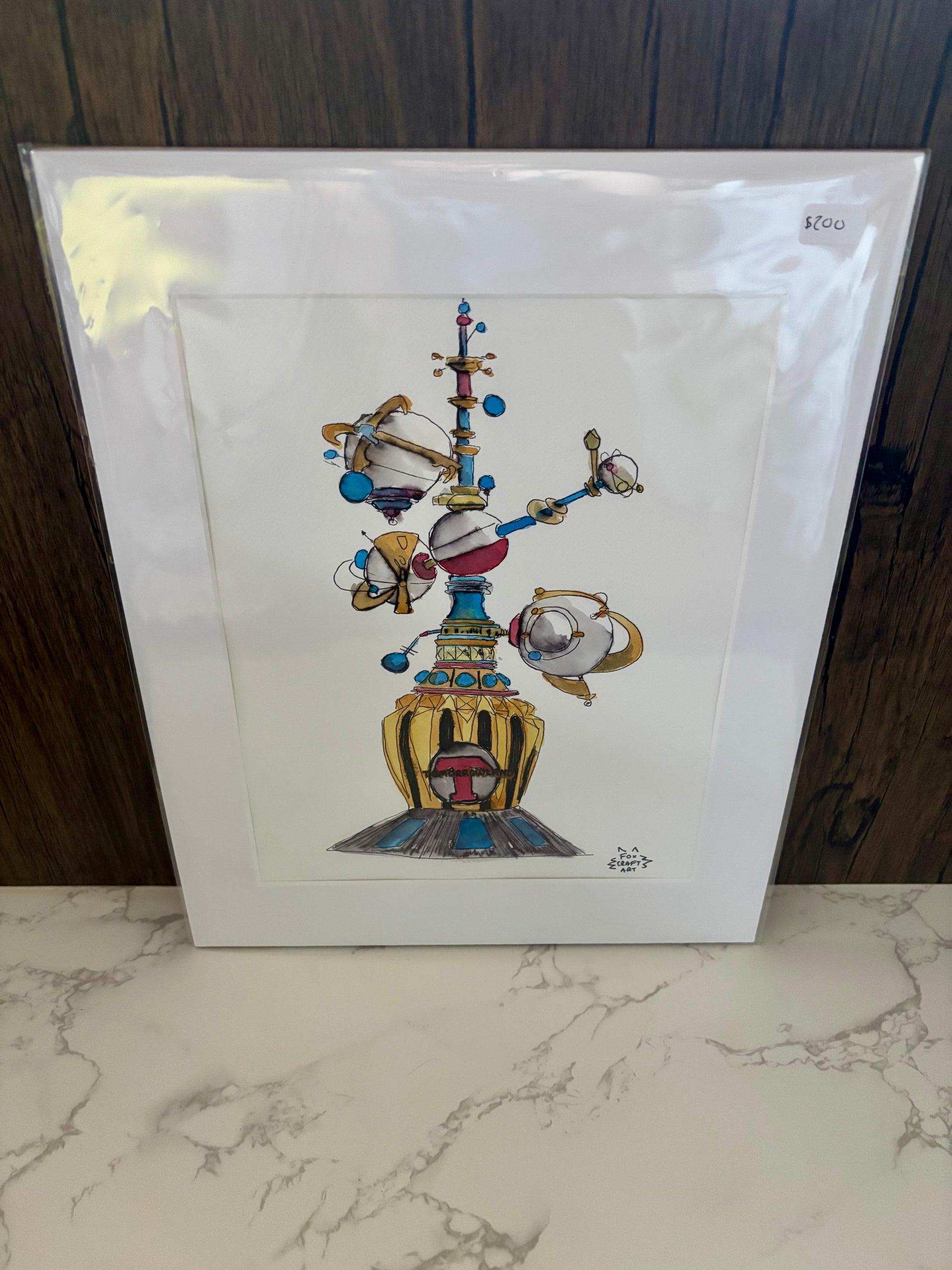 9x12in watercolor painting of an Amusement Park Future Scifi Attraction. Painted by Fox Craft Art.